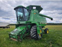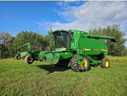 2000 John Deere 914 14 ft pick-up header, variable speed reel, fore & aft, reverser, rock trap, chaff spreader, fine cut chopper, grain tank extensions, 20 ft auger, air foil sieve, A/C, radio, buddy seat, updated LED lighting, 30.5L-32 front tires, 14.9-24 rear tires