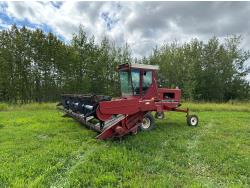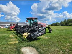 2010 MacDon D60-S triple delivery rigid draper header, pickup reel, double knife drive, fore & aft, gauge wheels, skid plates, crop dividers, Cummins 4.5 L 4 cylinder diesel engine, A/C, radio, air ride seat, buddy seat, 600/65R28 front tires, 16.5L-16.1 rear tires