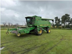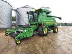 2000 John Deere 914 14 ft pick-up header, crop catcher, variable speed reel, fore & aft, reverser, rock trap, chaff spreader, fine cut chopper, grain tank extensions, 20 ft auger, grain tank tarp, A/C, buddy seat, Green Star ready, yield monitor with mapping, 30.5L-32 front tires, 18.4-28 rear tires