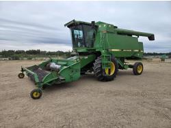 John Deere 914 14 ft pick-up header, reverser, rock trap, chaff spreader, chopper, 20 ft auger, A/C, radio, buddy seat, 30.5L-32 front tires, 16.9-26 rear tires