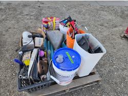 miscellaneous tools, masking paper, paint sprayer, pail of Chem frost, painting supplies, hardware