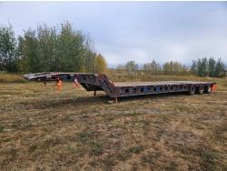 10 ft wide, aluminum pull out extensions to 15 ft wide on main deck, 30 ft long main deck and 13 ft long rear deck. wide load and rear strobe lights, flip neck extension for tandem jeep and removable pin with 3 hole location, 3 bar winch’s, in floor chain tie downs, hydraulic stinger arm on removable neck, rear mounted hydraulic winch, flip up ramps for rear deck loading, air ride, all aluminum rims, 225/70R22.5