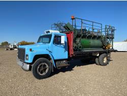 International V8 gas engine, 5x2 manual transmission, 18 ft 3 inch x 8 ft 2 inch deck, 4500 liter steel tank, Monarch 205GP pump, 4 cylinder gas engine, upper deck controls, spring suspension, 188 inch WB, 11R22.5 tires