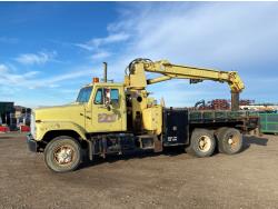 Detroit 6-71 6.9 L 6 cylinder engine, Eaton Fuller RTO-9513 13 speed manual transmission, 8 ft x 14 ft 3 inch deck, PTO pump, Pitman PC750 3 section 15 ft straight boom crane, outriggers, spring suspension, diff lock, 216 inch WB, 10-20 tires