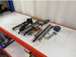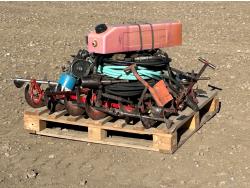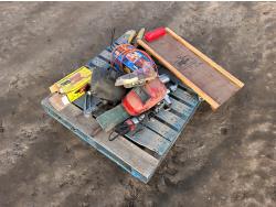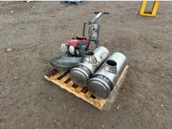 includes (1) 6000 BTU The Bruest B624GGLP catalytic LPG heater, (1) 8000 BTU Cata-Dyne BX24X24 natural gas heater, (1) 14 inch cultivator sweep, (1) 120V chain saw w/ 11 inch blade, metal gazebo parts, (2) metal racks, and (1) plastic rack