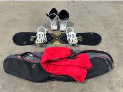 Flow Strike 155 snowboard, Rossignol size 10.5 snowboard boots, ski goggles, gloves, Firefly size XL ski pants, Mole snowboard bag