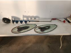 (4) life jackets, mini basketball net, tackle box with contents, Bear youth compound bow, Camp Chef grill