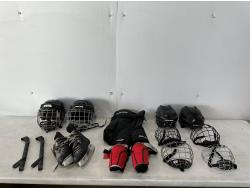 (4) helmet cages, (4) helmets, Bauer youth medium hockey pants, youth skates