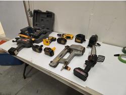 Max rebar tier, 18volt Dewalt impact driver & drill with (2) batteries and charger, Maxium 18V cordless drill kit, 12v tire pump, air stapler, Max cordless chain saw