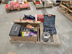 (2) small floor jacks, 1/2 inch air impact, 3/8 inch air ratchet, heat gun, electric glue gun, roll of chain, Dremel, Mastercraft Brad nailer, tools with miscellaneous wrenches, miscellaneous items