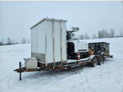82 inch wide deck, wood deck, spring suspension, ball hitch, tool / storage box, stake pockets, Allmand Maxi-Lite II light tower, Isuzu 4 cyl diesel engine, insulated heated dual bathroom, slip tank w/electric pump, dumpster , 7000 lb axles, 235/80R16 tires