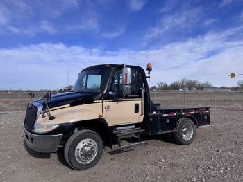 International VT 365 6.0 L V8 195 HP diesel engine, automatic transmission, A/C, cruise control, leather interior, air ride driver seat, stereo, 5th wheel ball hitch, CM Trailers steel headache rack, steel tool boxes, 7.5 ft x 9.5 ft deck, beacons, air ride suspension, 8,000 lb front axle, 15,503 lb rear axles, all aluminum wheels, 245/70R19.5 front tires, 245/70R19.5 rear tires