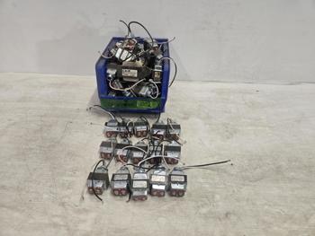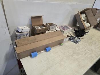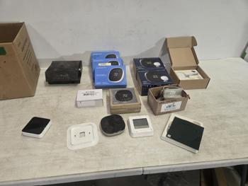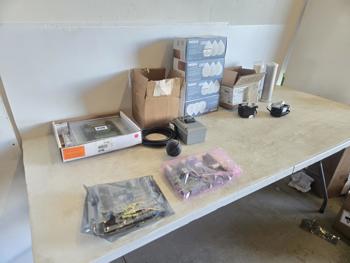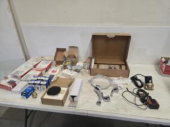 qty of wall thermostats, faucet parts, (2) chargers, unused water circulating pump, (7) 1/8 inch automatic float vents, qty of electrical valves and parts