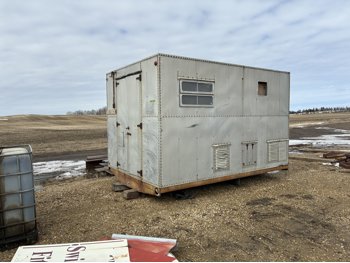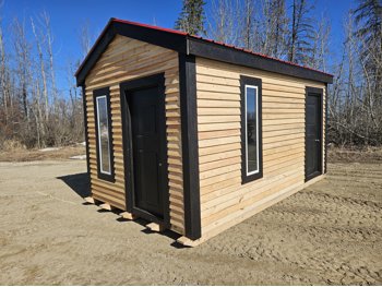 123 inch wide x 209 inch long, (2) man doors, (3) windows, tin roof, wood frame, on skids, 1x6 wood siding
