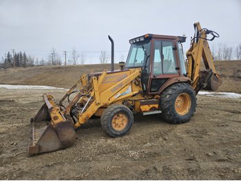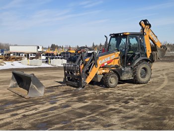 Enclosed cab, A/C, air ride seat, pilot controls, 4 speed powershift transmission, extend-a-hoe, 92 inch smooth loader bucket, 24 inch dig backhoe bucket, hydraulic Q/C coupler, 1 front auxiliary hydraulics, outriggers, C/W 48 inch forks, Q/A loader bucket, 12.5/80-18 front tires, 21L-24 rear tires