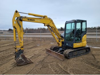 Enclosed cab, A/C, heated seat, side view cameras, positive air shutoff, windshield and top cab protection screen, 42 inch dig bucket, manual coupler, hydraulic thumb, 1 auxiliary hydraulics, 10 Ft 8 inch stick, 31.5 inch track pads, triple grousers