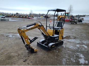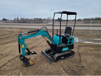 Open station, gas engine, 14 inch bucket, manual coupler, manual thumb, backfill blade, 7 inch rubber tracks
