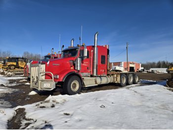 Cummins ISX600 15 L 6 cylinder 600 HP engine, engine heater, engine brake, Eaton Fuller 18 speed manual transmission, mid rise 60 inch Aerocab, sleeper, A/C, leather interior, air ride driver seat, radio, hydraulic wet kit, moose bumper, headache rack, tool boxes, hydraulic winch, air ride suspension, 16,000 lb front axle, 60,000 lb rear axles, full lockers, 4:10 ratio, rear frame slope with live roll, all aluminum wheels, 385/65R22.5 front tires, 11R24.5 rear tires