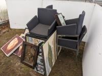 (2) chairs, folding chair, (2) side tables, 24 inch wide X 20 inch deep X 24 inch high, (1) side table 64 inch wide X 24 inch deep X 19 inch high, ottoman, qty of pictures, picture frame and radio