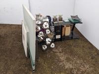 Chair, table 31 inch X 31 inch X 19 inch h, (2) table lamps, prints, pictures, miscellaneous
