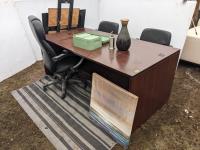Desk 71 inch wide X 35.5 inch wide X 29.5 inch high, (3) chairs, (3) mirrors, set of tins, picture, rug, misc