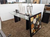 Glass top table 67 inch long X 39.5 inch wide X 30 inch high, framed picture, (2) table lamps, (3) vases, (2) candle holders