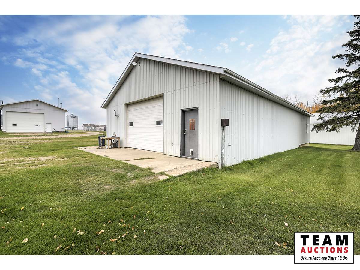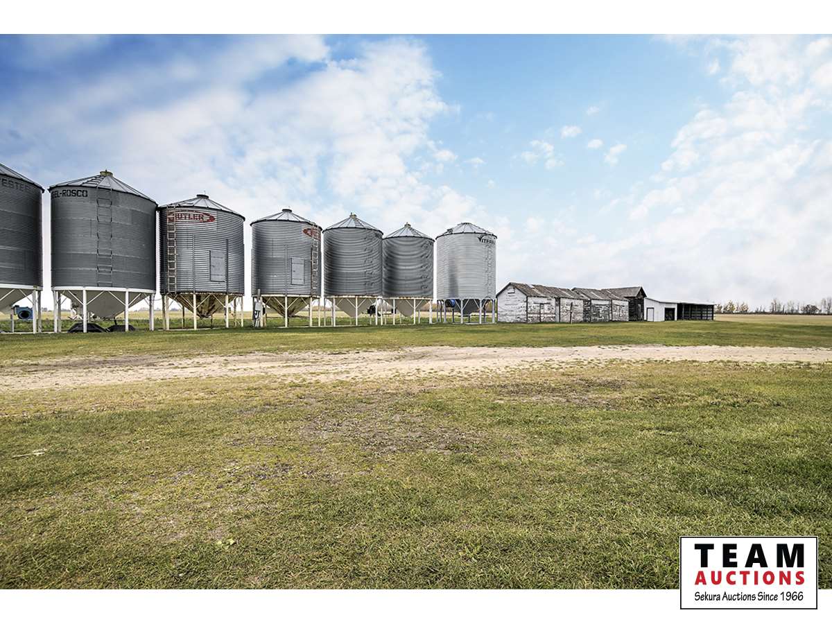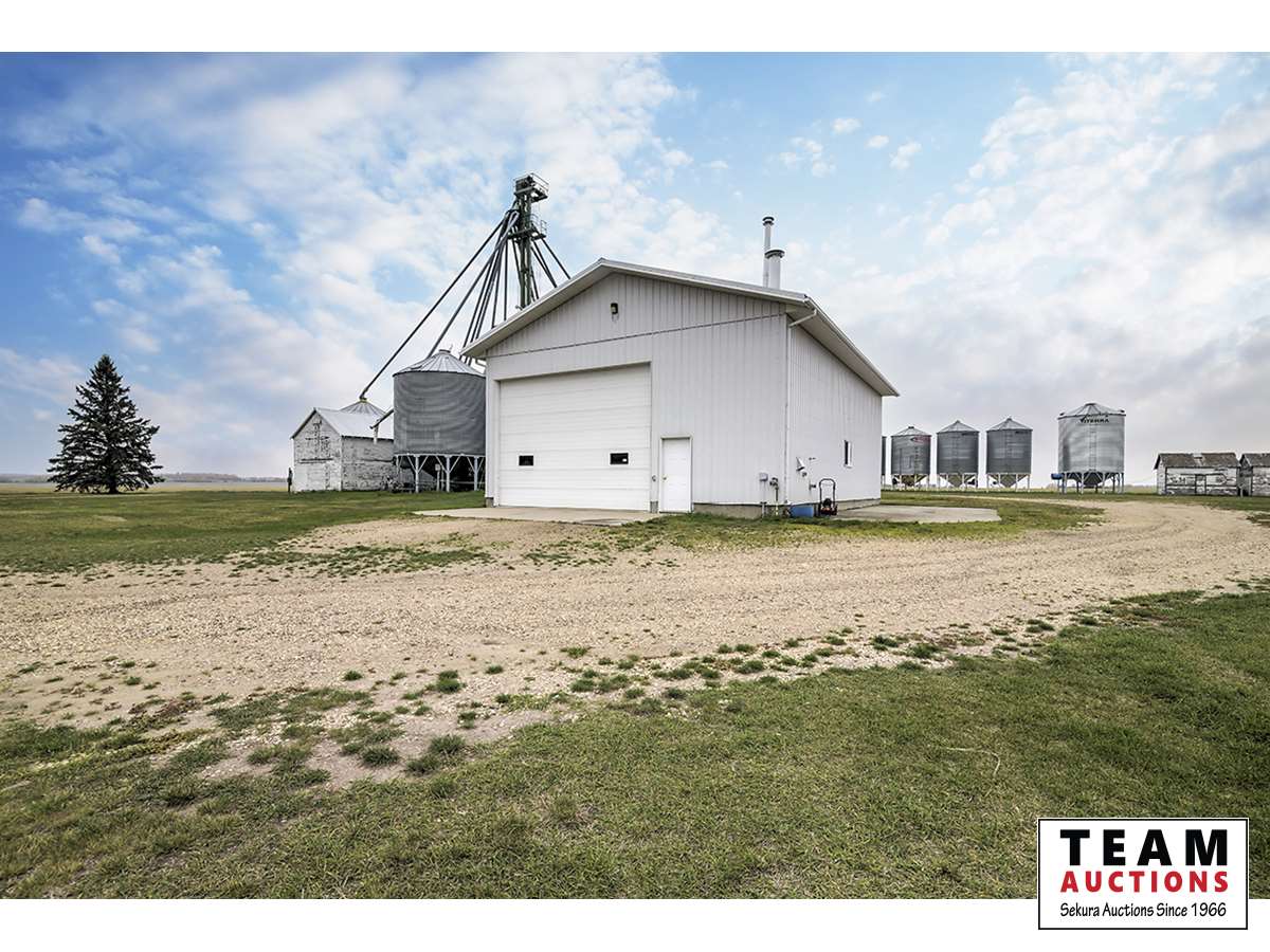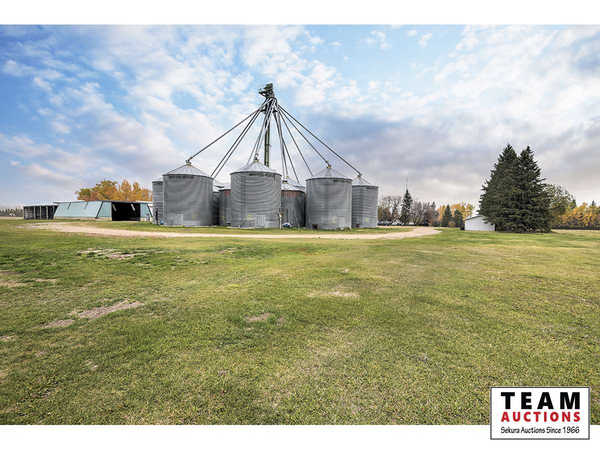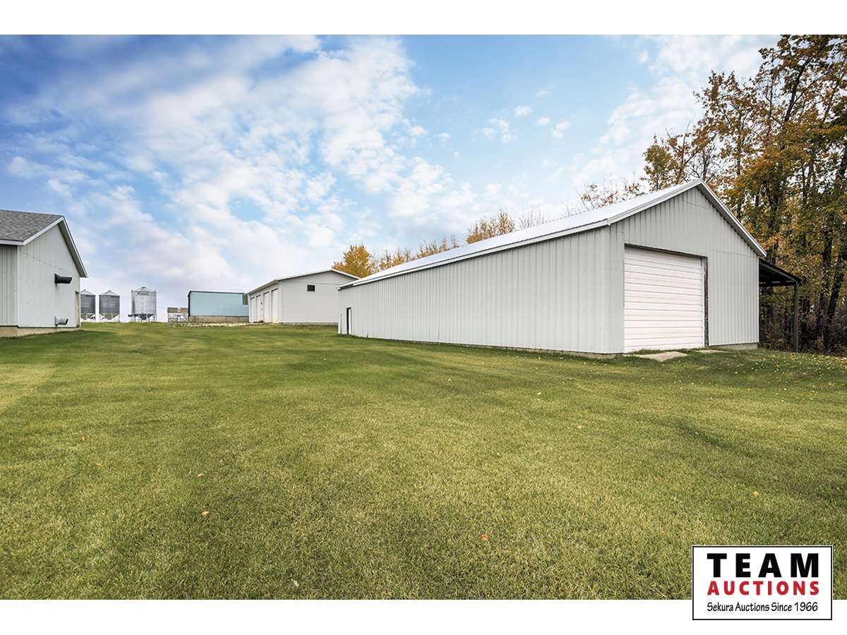 Home 1973 built, 1800± sq ft (4) bedrooms, (3) bathrooms Main floor laundry Stucco exterior, tar and gravel roof Hot water base board heating New HE boiler last year, HWT 2015 Carpet & linoleum flooring Main Floor Large rear porch w/ 2 pce bath & laundry room w/ sink Open concept kitchen & dining area w/ U shaped kitchen, island w/ power, counter top electric range, BI oven, & access to dual sided wood burning fireplace Bright living room w/ A-frame style windows, dual sided wood burning fireplace, front door access & closets, & attached garage access 2 large bedrooms w/ double closets 5 piece main bath w/ double sinks Developed Basement 2 large bedrooms 5 piece bath w/ double sinks Large family room w/ dual sided wood burning fireplace Mechanical room w/ gas stove (used for canning) & well system Attached Garage Single Vehicle Heated Outbuildings 34 x 64 Ft, insulated, heated w/ in floor heat & HE boiler, concrete & small portion wood floor, portion used for paint room w/ exhaust, bolt bins, air compressor, (2) 10’ high doors, shingled roof 34 x 50 Ft, insulated, heated, concrete floor, mechanical room w/ steam washer & exterior concrete washing apron, air compressor, 14 Ft door, tin roof 36 x 80 Ft, metal clad cold storage building w/ 12 Ft doors on each end, dirt floor, tin roof 40 x 80 Ft, metal clad cold storage building w/ (4) 14 Ft doors, gravel floor, tin roof 48 x 96 Ft, steel frame cold storage building, concrete floor, 48 x 100 Ft open faced machine shed attached at rear 26 x 100 Ft open faced machine shed Grain Handling System MC 975 Continuous Grain Dryer & leg grain handling system, 4-Westeel bins on hoppers, 2-Butler bins on hoppers, 1-Viterra on Hopper, 8-Weststeel on concrete, 4-Butler on concrete, 1-Superior on hopper, 7 older wood granaries Utilities Power, natural gas 2011 drilled water well (400 Ft deep, 7.2 gals per minute registered at time of drilling) Above ground septic discharge system