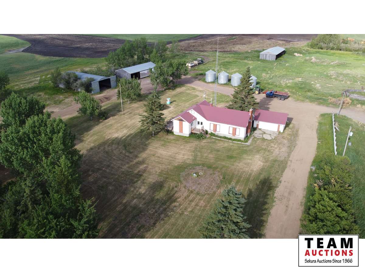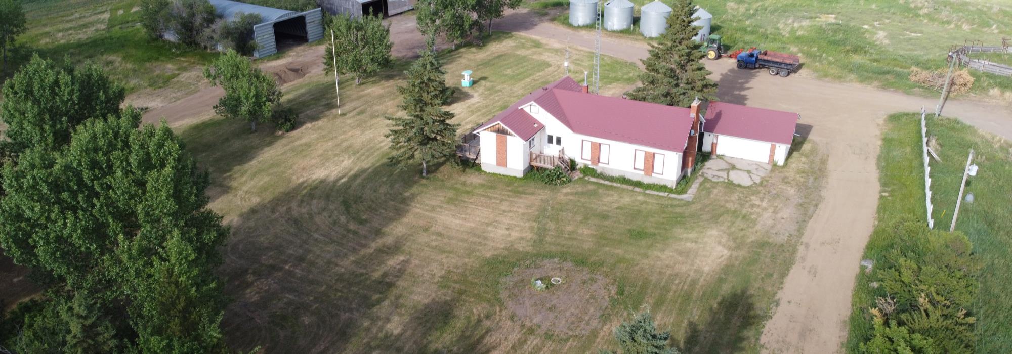 Home: 19.99± acres with panoramic views from this sprawling, sundrenched bungalow with contemporary finishing elements! Quality craftsmanship and tasteful décor blend to bring this to an effective age of 25 years. Accents of wood beams along with original coffered ceilings blend harmoniously with details of days gone by along with the warmth and charm of modern rustic that welcomes you. Nestled into a mature yard, the over 1500 sq. ft. home has been lovingly maintained and offers recent upgrades including the kitchen, 4 pc bath, flooring and lighting. Main floor includes: Sunken living room (4.65m x 6.98m) showcasing a vaulted cedar lined ceiling, w/b brick facing fireplace, huge south facing windows. Has been used as the primary bedroom c/w closets Formal Dining/Sitting Room (4.00m x 4.67M) Kitchen (3.50m x 3.95m) with soaring vaulted ceiling, abundant counter space, stainless steel appliances including countertop range and built-in oven with complimentary brick faced accent wall. Flex/Gathering Room ( 3.35m X 4.00m) Casual Dining/Eating Nook ( 2.30m x 3.83m) Primary Bedroom (2.72m x 5.85m) Walk In Pantry/Storage. 4 pc bath, Lots of counter space and storage cabinets Lower level offers: Mechanical area with a water treatment system, sump pump Furnace, hot water tank and built In vacuum system Laundry area and spacious area designed as coat and boot room Balance of the basement is open and ready for you to create your vision according to your needs. Low Maintenance: Exterior offers metal clad windows, stucco with brick accents, steel tile roof and pressure treated decks. Outbuildings Include: Garage 22ft x 24ft Dog Kennel 10ft x 10ft Quonset 40ft x 70ft (walls on concrete grade-beam) Machine Shop 30 x 65 10 Grain Bins (4) 1500 BU steel bins on concrete floors, (4) approx. 4900 BU steel bins on concrete floors, (2) Steel hopper bins on concrete base Additional Features of this Property: There is an existing concrete pad 32x40 with potential for future building 2 Gated access laneways to yard Rail fence across the front of the yard. Waterline approx. 6” line (on title) from North Saskatchewan River to the dugout. Alarm/Security System Recently upgraded septic system with alarm 182 Tonnes of gravel recently added to yard and driveways Utilities: Power, Natural Gas, Drilled Well, Septic Tank & Surface Discharge System c/w Alarm Taxes: 2021 were $810.44