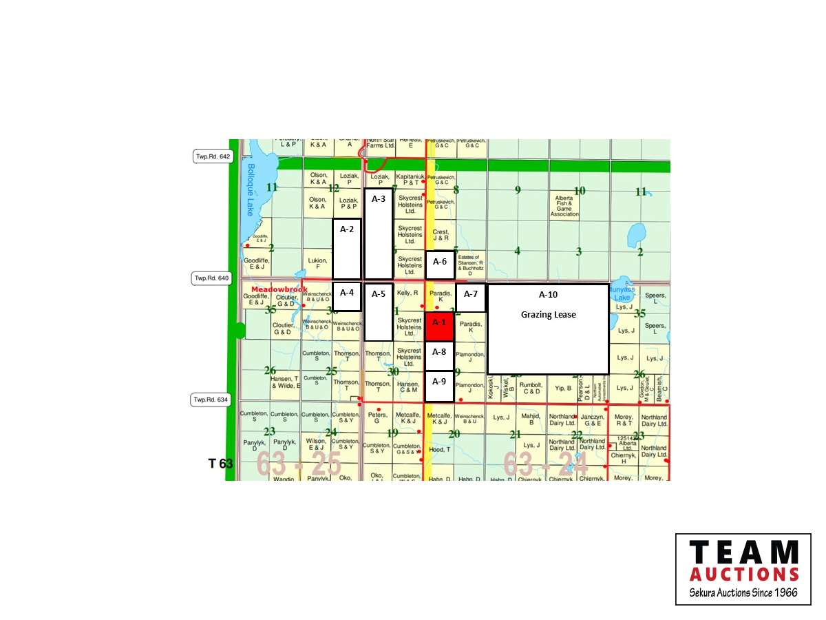 - 20 acres treed, 84 Acres barley/oat mixture for silage, remainder pasture, wet well & pond NOTE: All real estate bidders must pre-qualify themselves prior to registering to bid with Team Auctions. A financing pre-approval letter or proof of funds is required and can be provided to either Royal LePage Town & Country Realty or Team Auctions to have desired bidding limit approved. Keith & Susan Anderson & family have farmed these properties for the past 20 years. They have an excellent herd management system and have grazed up to 400 head of cattle on the deeded land. This is an amazing opportunity to obtain a package of this size with good fencing, cross fencing, water & home quarter with buildings. On behalf of Royal LePage Town & Country Realty & Team Auctions we wish Keith and Susan all the best for their retirement.