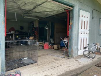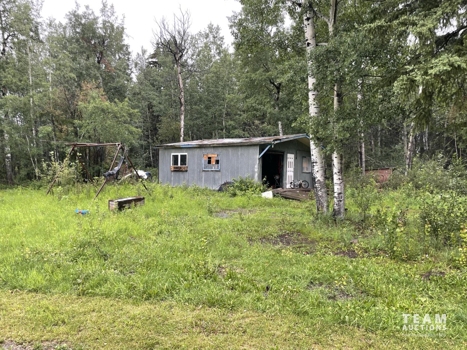 - Large shed with overhead door, plank floor