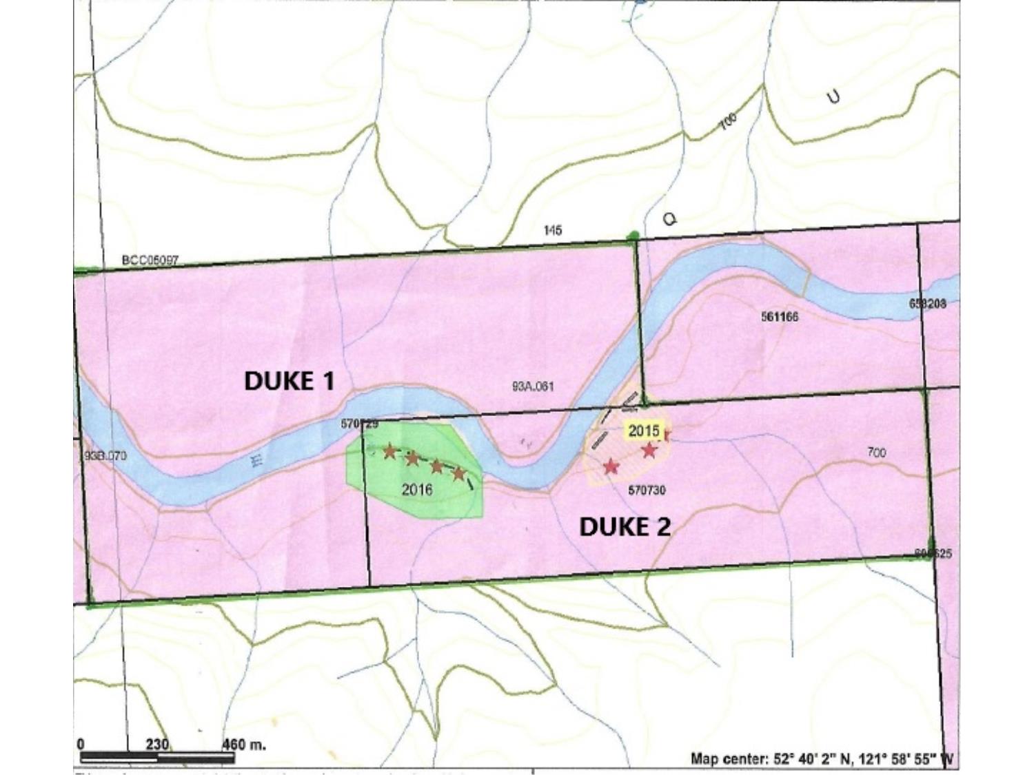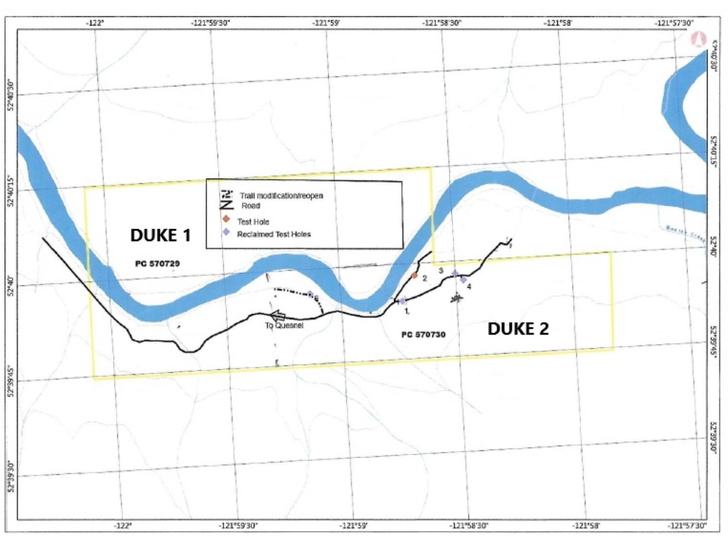 Duke 1 & 2-southwest side of the Quesnel River, there is a good access road, which is the Hydraulic Road (an all weather road), that goes through the claim.