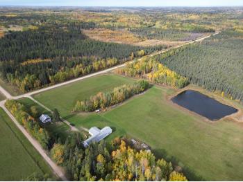 For the outdoor enthusiast… Spanning 161 acres, this property is complete with cozy home, heated workshop, heated garage, large storage space, picturesque pond, trails through the trees to explore, open spaces, massive dugout, and an abundance of trees. The quaint story-and-a-half residence boasts a galley kitchen, a dining room, a cozy living room, a bedroom, an updated four-piece bathroom, and a generous entry on the main floor. Upstairs, you'll find two spacious bedrooms along with a convenient two-piece bathroom. The asphalt shingles were newly installed in 2024. The living room is enhanced by a wood stove and patio doors that lead outside. One of the upper bedrooms also features patio doors secured with a safety bar, and there's plenty of storage available on the upper level. The workshop and storage facilities offer a 40x30 heated space perfect for your projects, a 64x30 storage area, and a 30x31 heated garage equipped with two overhead doors on the west side and a smaller overhead door on the south side. Between the garage and the storage area, the wall has been built for future garage door. This door is included but not installed.