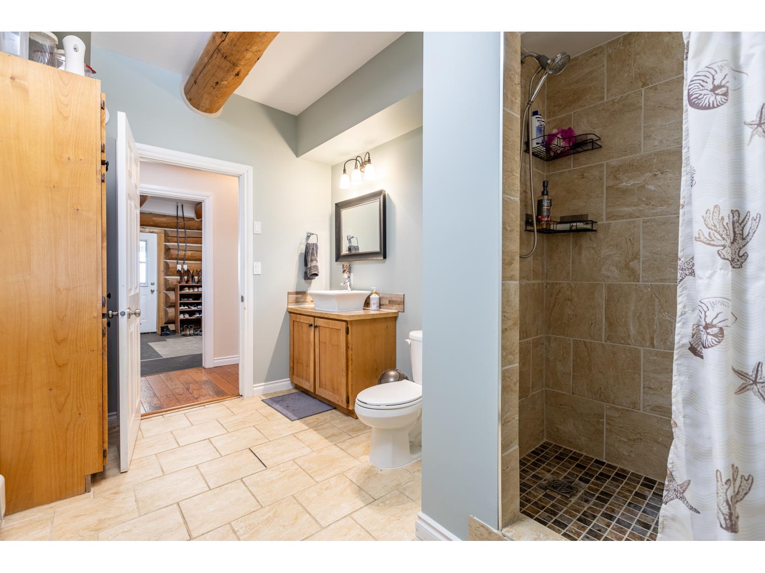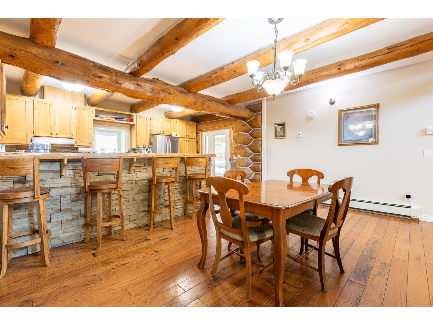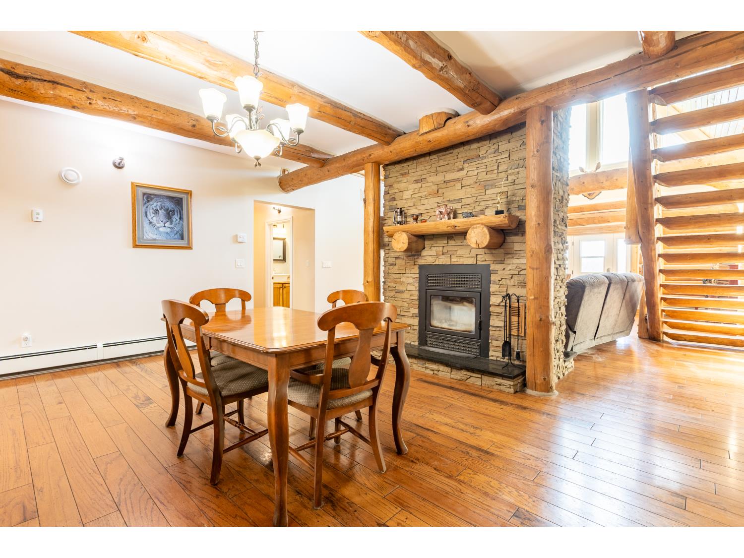 This remarkable 53-acre property sits on a paved road and features an incredible 3,700 sq ft custom log home, built with care and attention to detail by the current owners between 2007–2015. The home blends rustic charm with modern design, including soaring ceilings, massive exposed beams, and oversized windows that flood the interior with natural light and provide beautiful views of the surrounding landscape. The combination of modern finishes creates a warm, inviting atmosphere while offering the comforts of contemporary living. The main floor is approximately 2,000 sq ft and features hardwood floors, an open-concept kitchen, dining, and living area centered around a stunning double-sided wood fireplace, and space for both entertaining and day-to-day family life. A large mudroom, two spacious bedrooms and two full bathrooms complete this level. Upstairs, the 1,700 sq ft upper level is fully carpeted for comfort and includes two more bedrooms, a dedicated office, an additional full bathroom, and a large family or flex room overlooking the main living area below. A wrap-around covered porch encircles the home, offering multiple seating areas to enjoy sunrises, sunsets, or quiet moments in nature. The exterior is finished with a durable metal roof, ensuring low maintenance for years to come. The home is serviced by a drilled water well with a reverse osmosis system and a septic pump-out system installed approximately 10 years ago. A long private driveway winds through the property and leads to the house, with teardrop loops at both the front and back for easy vehicle access. At the rear of the home sits a 30x60 shop—fully insulated and drywalled, with concrete floors and a large overhead door—ideal for equipment storage, hobby farming, or a home-based business. A 24x38 outbuilding offers even more flexibility and could be used for horse stalls, additional storage, or workshop space. Much of the property is fenced with 4-wire strand, making it suitable for livestock. A natural wetland area runs along the back portion, and the land features a mix of open pasture and treed areas, offering both function and privacy. This exceptional property combines natural beauty, modern comfort, and rural practicality.