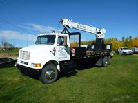 International, diesel, 9 speed transmission, 15.5 ft deck with storage boxes, fold down sides, 8 Ton Pitman Hydra Lift 3 stage stiff boom picker, dual controls, stabilizers, like new 11R22.5 tires