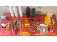 Paddles, Anchors, Lights, Bumpers, Flares, Ropes, Whistles, Night Blaster 400,000 Candlepower 12 Volt Handheld SpotLight, 5 Soft Sided Boat Fenders, Seachoice Galvanized 25 ft 30 ft Boat Anchor, Smaller Galvanized Boat Anchor, West Marine Bilge Pump, Rain gear, Shields 1/2 inch x 25 ft Non Toxic Tasteless Odorless Clear Reinforced Marine Hose, Marine First Aid Kit, Stainless Steel 1/4 inch Coated Lift or Tow Cables with Stainless Hooks, Marine Flare, Marine Whistles & Compass, Marine Rescue Rope with Float, Classic MercCruise Hat