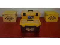 (2) Very Heavy Built Steel Boxes, lined with 1/2 inch Plywood Lockable, 15 inch Wide x 11 inch Deep x11 inch High, 25 inch Mastercraft Tool Box with See Through Lid Parts Storage, 19 inch Voyager Tool Box with See Through Lid Parts Storage