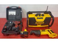 Dewalt 18 Volt Variable Speed Reciprocating Saw, Dewalt AM/ FM Stereo & Battery Charger, Dragon 18 Volt 2 Speed Cordless (New in box) Hammer Drill, Two 18 Volt Batteries, Charger & Handle<br/>