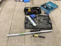 Letter punches, cement trowel, level, qty of hooks, wood trim, drywall tape and qty of hand tools