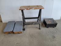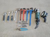 5 Speed 37 inch Wood Lathe, 120 Volt Up to 37 inch Spindle Turning & 12 inch Inboard Bowel Complete with 7 pieces/Set Wood Lathe Chisel, Assorted end Wrenches, Black & Decker 3/8 inch Variable Speed Reversing Drill with Sanding Disk Attachments, Small Portable Buck Saw, Come along, Wire Stripeasy, Black & Decker Woodmate Plus Portable Vise Work Table, Snow Shovel