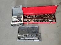 Large Ammunition Box, B&D 1/2 inch Impact & 3/8 inch B&D Drill, 3 Ton Jack Stand, LED 15 ft Drop Light, Impact Socket Set, 1/4 inch Ratchet Socket Set, Small Tool Set, Caulking Gun, shovel, truck rail<br/>