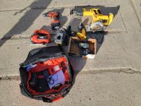 Ridgid 18 Volt Drill, Charger & Battery, Dewalt 3/8 Electric Drill<br/>Black & Decker Professional Jigsaw, Work light, Ridgid 1/2 inch 18 Volt Impact Driver, Battery & Charger, Black & Decker Router, Dewalt Circular Saw, 500 Watt Halogen Work Light