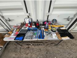 (2) Hack saws, Dremel Bit set, (7) pairs of plyers, and cutters, (1) pair snips, ball peen hammer, sledge hammer, wire brush set, socket set, drill bit sets, and various other tools, and accessories.