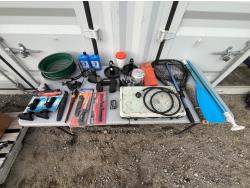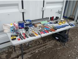 (1) Tuff-lift 12Ft, type 4 sling. (2) new 1650 lb rachet straps, (1) heavy duty rachet, drill bits, (21) piece large screw driver set, (2) lighters, (7) pieces various pliers and cutters, rubber mallet, (8) wrenches, various sockets, Allen key set, small hatchet, and various other tools and accessories.