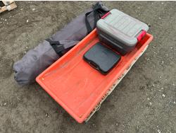 Portable ice fishing tent, equipment sled, Mr. Heater 3800 BTU portable propane heater, portable butane stove, (6) 2 stroke engine oil 10 litre mix