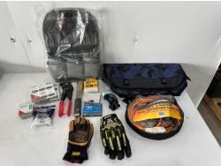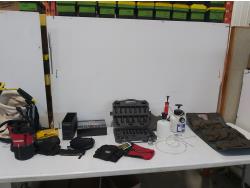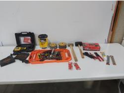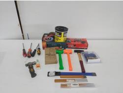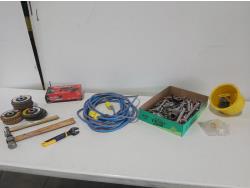 wrenches, sockets, extension cord, (2) ball peen hammers, adjustable wrench, nitrile gloves, (17) 4-1/2 inch surface conditioning discs