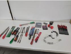 (5) screwdrivers, T-handle screwdriver, (3) adjustable wrenches, 1-1/2 inch chisel, 48 oz hammer, ergonomic pliers, snips, wire strippers, driver bits