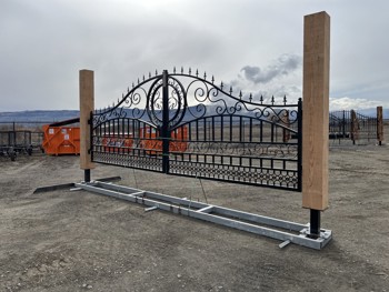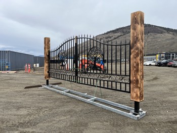 Premium BC Douglas Fir triple finish timber posts, forged steel construction, scrollwork design, 17 ft 6 inches gate opening, 21 ft x 7 ft total length