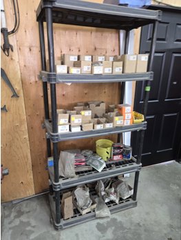 Shelf Unit with Wheel Weights and Tire Repair Supplies